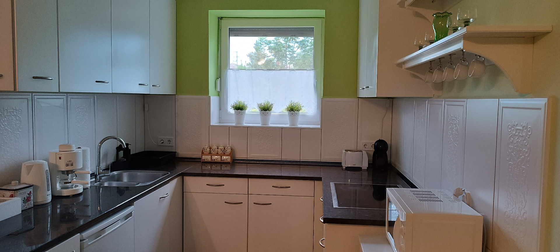 Indukciós tűzhely, mikrohullámú sütő, kávéfőző (hagyományos és kávékapszulás is), kenyérpirító, vízforraló, hűtőszekrény mélyhűtővel, étkészlet, poharak, konyharuha,